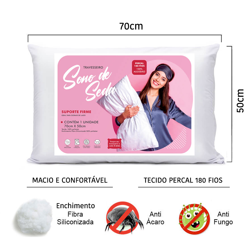 Travesseiro Sono de Seda Percal 100% Algodão Enchimento Fibra Siliconada Toque Super Macio