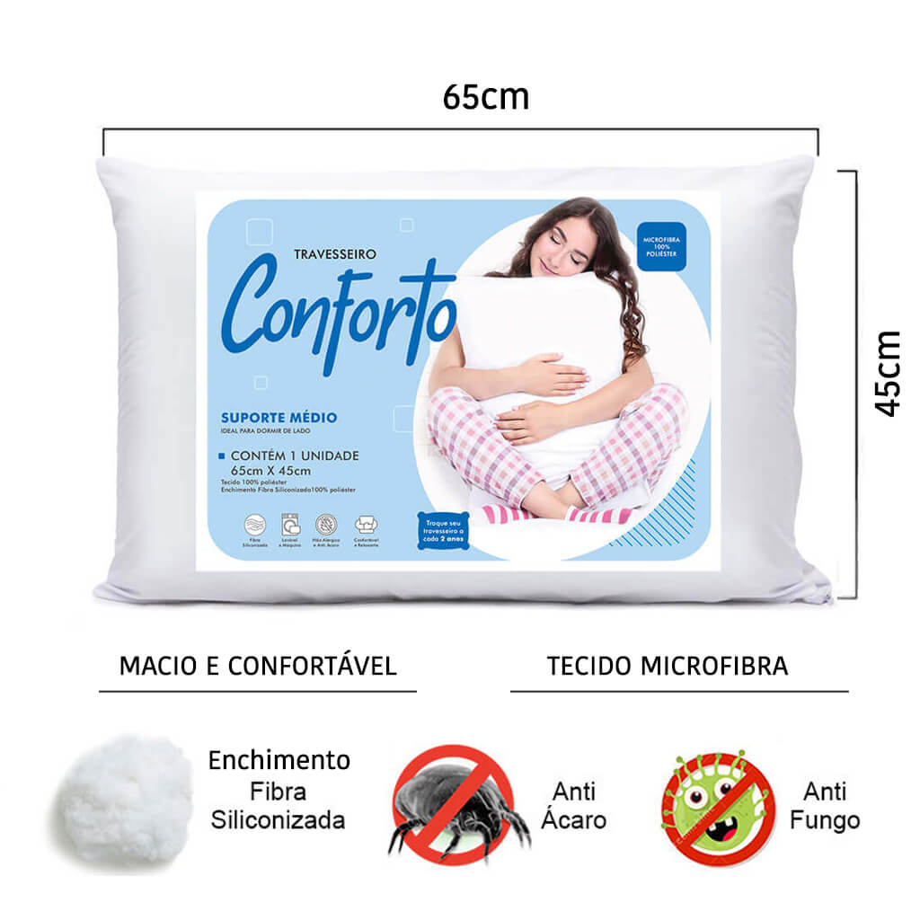 - Para Noites Tranquilas e Revigorantes! Durma com todo o conforto que você merece com o Travesseiro Conforto em Microfibra . Feito com materiais de alta qualidade, ele proporciona suporte ideal para o pescoço e a cabeça, aliviando dores e desconfortos, garantindo uma noite de sono reparadora.