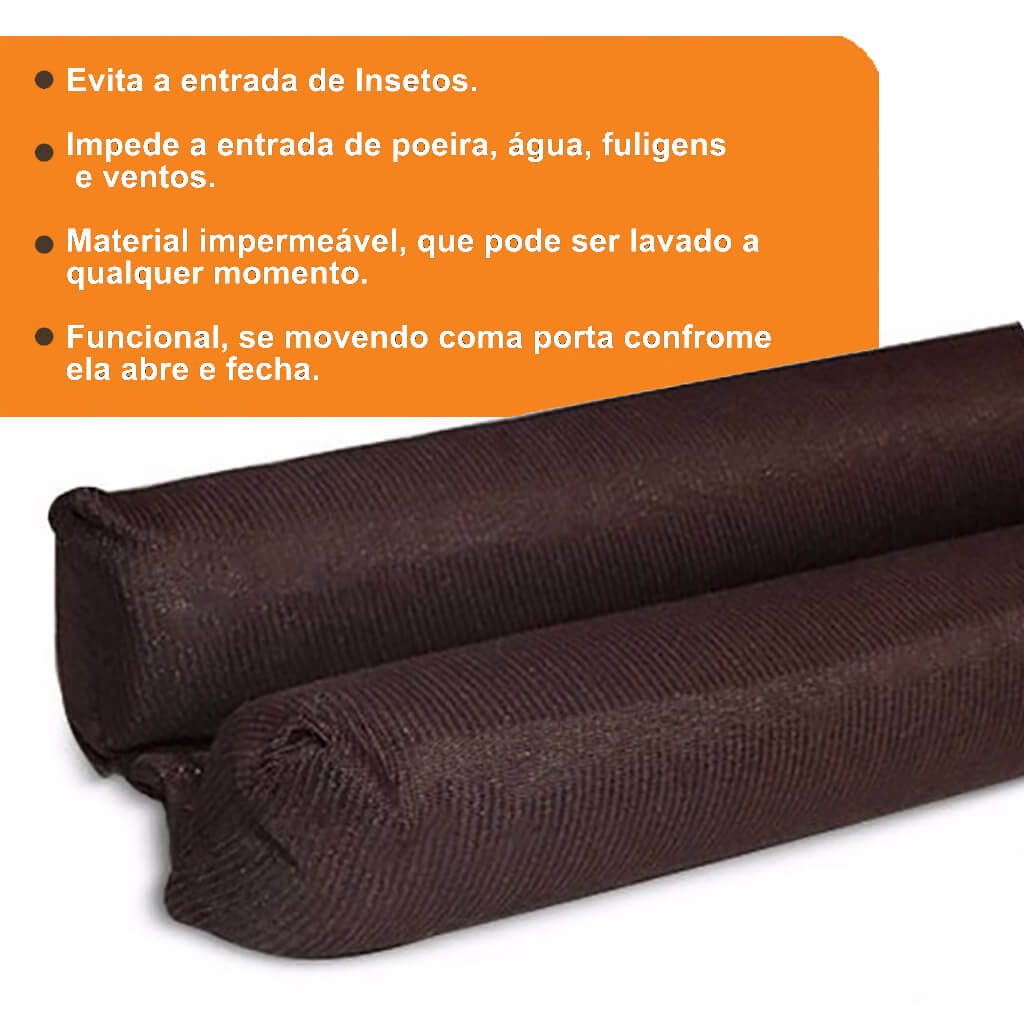Veda Porta Rolinho Protetor – Vedação Dupla Contra Insetos, Poeira e Vento O Veda Porta Rolinho é a solução ideal para bloquear frestas inferiores de portas, garantindo mais proteção e conforto para sua casa. Fabricado em tecido sintético de alta qualidade , ele não possui costuras, tornando-se impermeável e altamente resistente . Além de ser prático, ele acompanha o movimento da porta, oferecendo uma vedação eficiente contra insetos, poeira, vento e até mesmo ruídos externos.